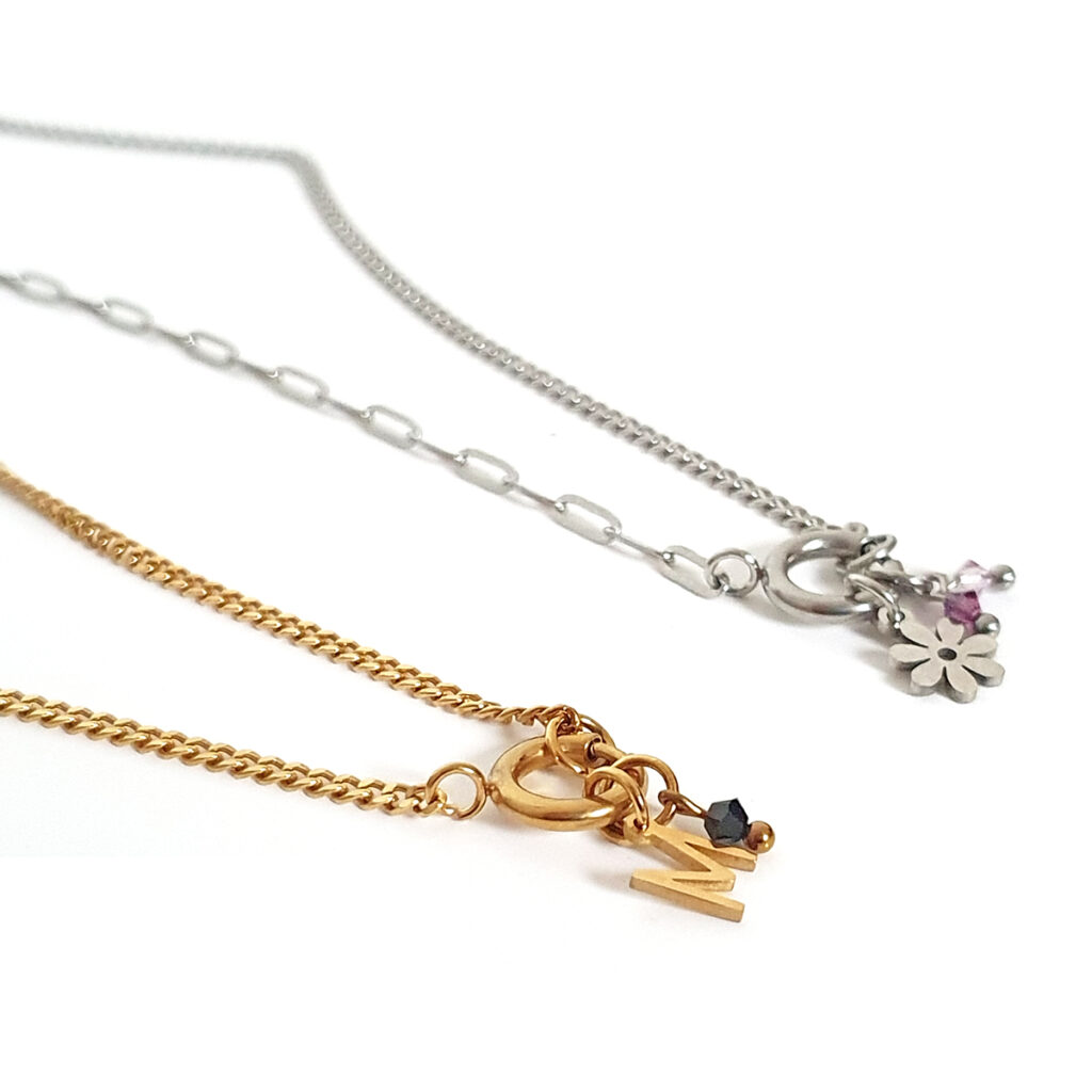 Ketting, voor om je nek, niet te strak, even testen hoe lang deze in doorloopt, is ie al aan het einde, wanneer begint de volgende?